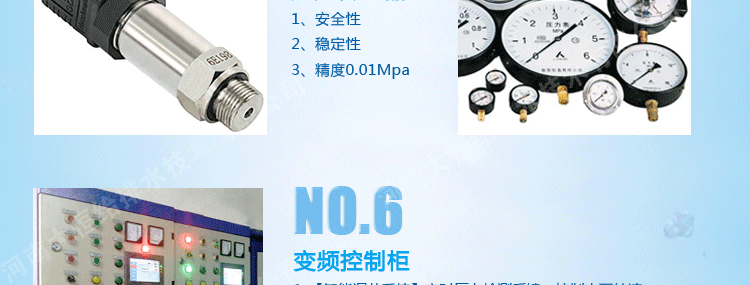 二次加壓供水設(shè)備主要由水泵機(jī)組、隔膜穩(wěn)壓罐(可選)、壓力傳感器、變頻控制箱(柜)、閥門管件等組成,能始終保持恒壓(即用戶管網(wǎng)水壓)等于用戶設(shè)定值。