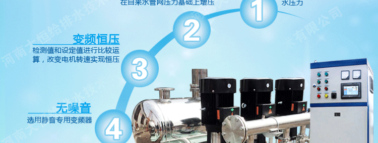 二次加壓供水設(shè)備主要由水泵機(jī)組、隔膜穩(wěn)壓罐(可選)、壓力傳感器、變頻控制箱(柜)、閥門管件等組成,能始終保持恒壓(即用戶管網(wǎng)水壓)等于用戶設(shè)定值。