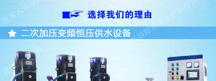 二次加壓供水設備主要由水泵機組、隔膜穩壓罐(可選)、壓力傳感器、變頻控制箱(柜)、閥門管件等組成,能始終保持恒壓(即用戶管網水壓)等于用戶設定值。