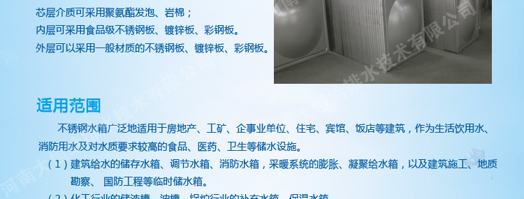 | 主營產品或服務 | 生產、加工、銷售、安裝于一體的不銹鋼水箱生產廠家,主營產品:不銹鋼水箱、鍍鋅水箱、二次加壓供水設備、無負壓供水設備、紫外線消毒器、熱交換設備、低壓配電柜、除鐵除氟設備、臭氧發生器、消防增壓穩壓設備、智能箱泵一體化設備、智能化水廠工程、遠程計算機網絡監控系統。 | ||