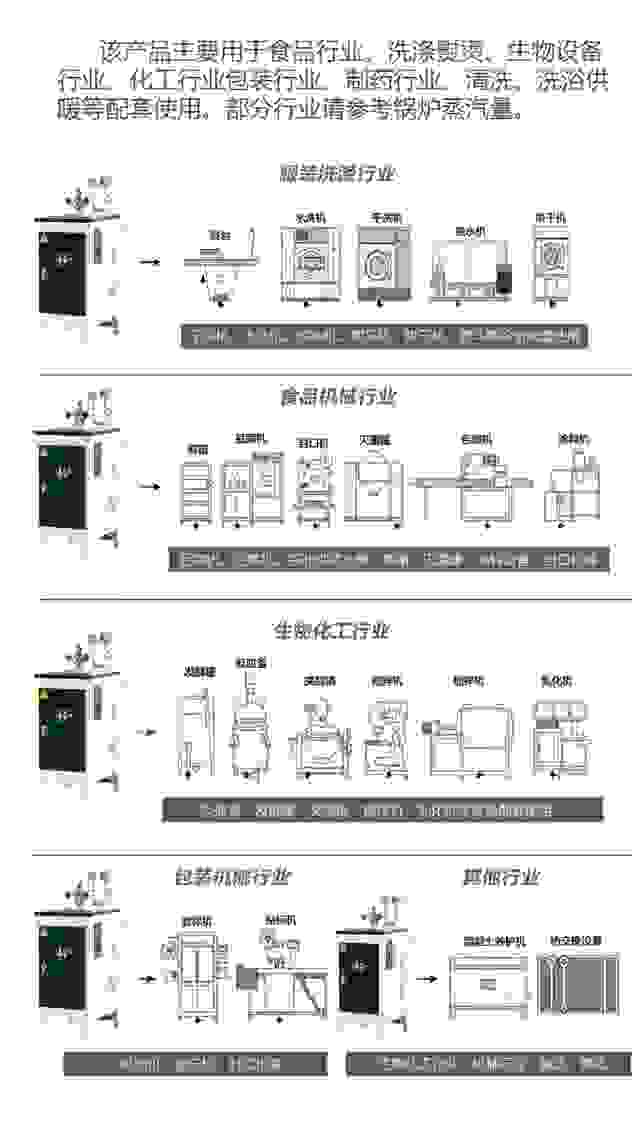 醫(yī)院,學(xué)校,紡織服裝行業(yè),大型超市,酒店賓館,食堂餐廳,食品飲料行業(yè),酒廠,制衣廠,印染廠,制藥廠,包裝廠,建材廠,涂料廠,飼料廠,塑料廠,橡膠,游泳館,洗浴中心,小區(qū)居民樓取暖,實(shí)驗(yàn)室,茶葉藥材烘干,其他